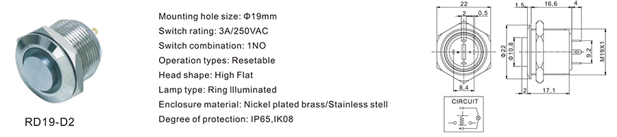19MM金屬開關(guān)RD19-A3 金屬開關(guān) RD19-A3 250VDC 3A / / ≥100,000 CYCLES 立即申請 下載